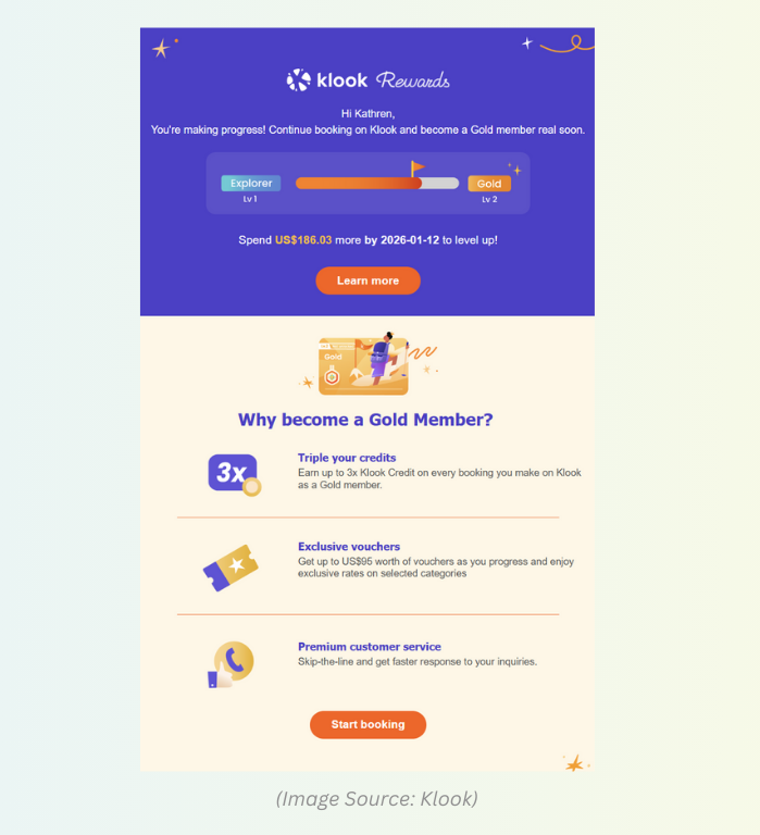 A great real-world example of this is Klook’s post-purchase communication. After a booking, customers receive updates that show their current rewards level, how close they are to the next tier, and what benefits they’ll unlock if they continue booking. The visual progress and mention of exclusive perks motivate customers to keep engaging, which prevents churn in the long run.