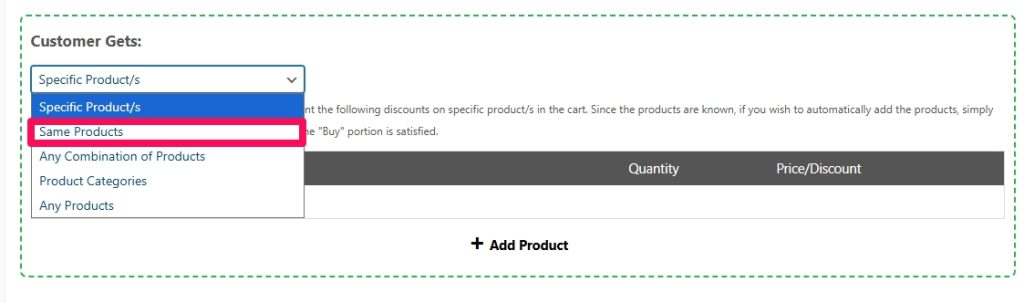 When creating a BOGO coupon in Advanced Coupons, you’ll now see a new dropdown option under Customer Gets → Same Products.