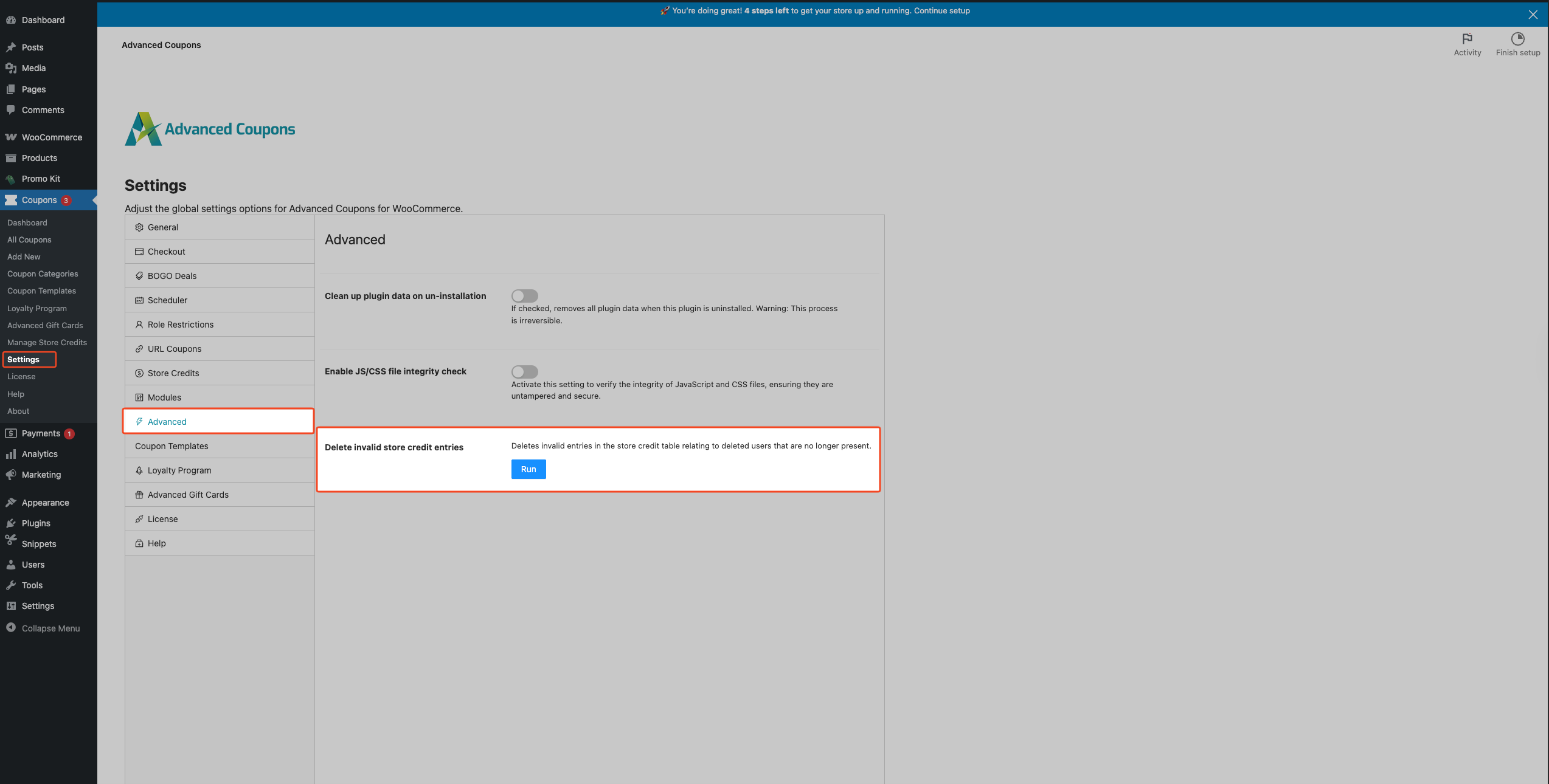 Turn on the Store Credits module under Coupons → Settings → Modules first. Without that module, the table may never be created, and you will see this error when running the cleanup. After enabling Store Credits, deactivate and reactivate Advanced Coupons (free) to re-create the missing Store Credits table, then run the cleanup again.