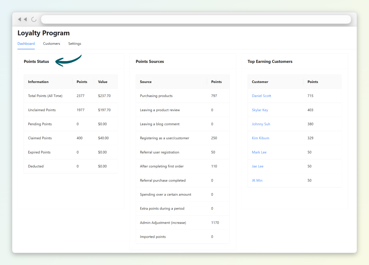 💡 GOOD TO KNOW: WooCommerce Loyalty Program makes this easy by showing a Top Earning Customers list in your dashboard. You can quickly see which customers have the highest point balances and how many points they’ve earned.