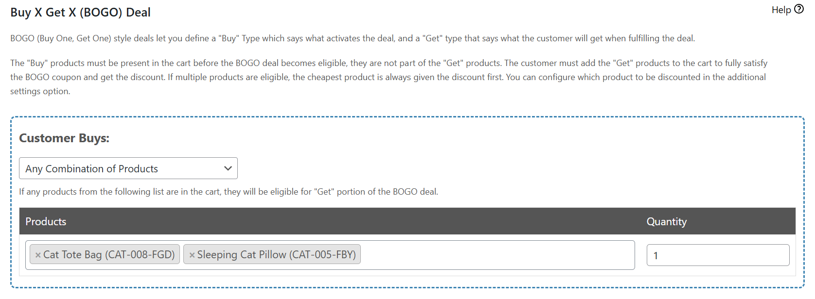In the example below, we’ve added two products (“Cat Tote Bag” and “Sleeping Cat Pillow” ) and set the Quantity to 1. This means that the deal will trigger when any one of these products is added to the cart.