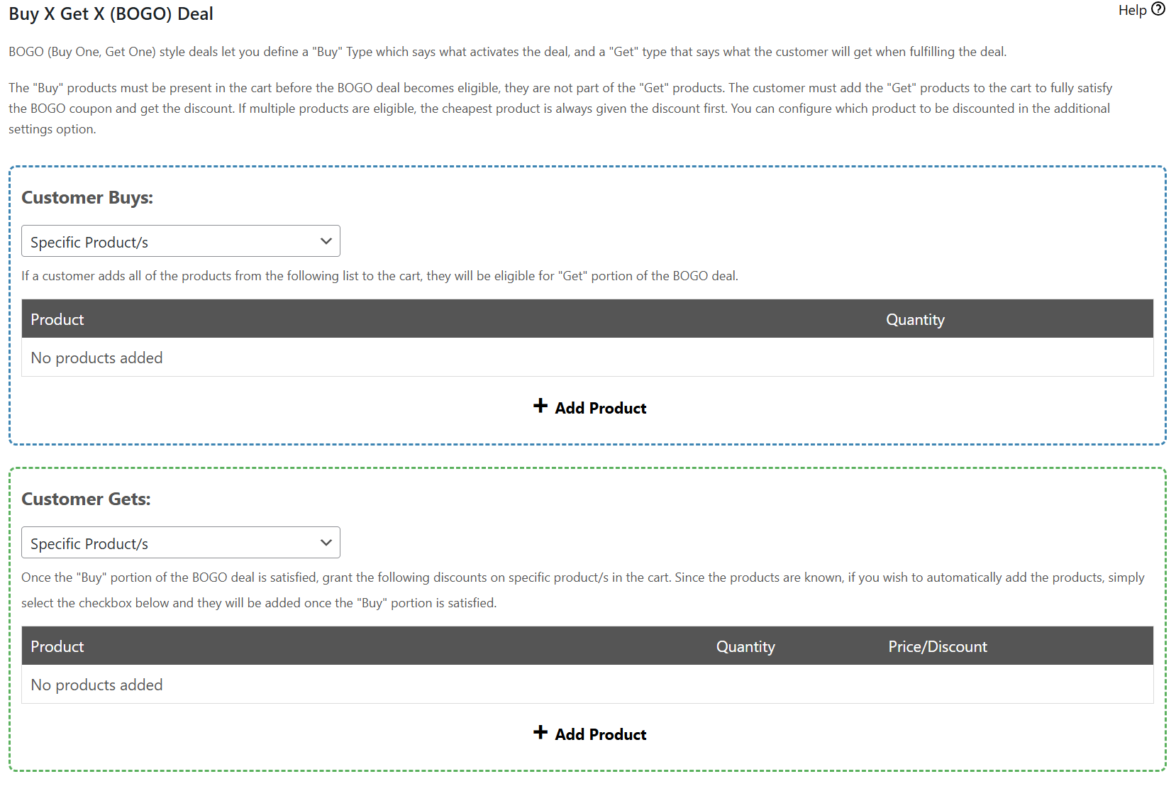 With Advanced Coupons, you have full flexibility to control exactly how your same product BOGO deal works through the Customer Buys and Customer Gets section.