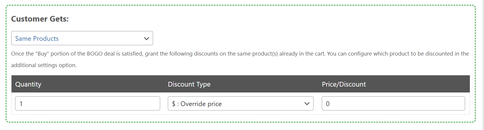 The Customer Gets section lets you define what the shopper receives after meeting the trigger condition. Select the “Same Products” option to automatically apply the BOGO deal to the same product the shopper added to their cart.