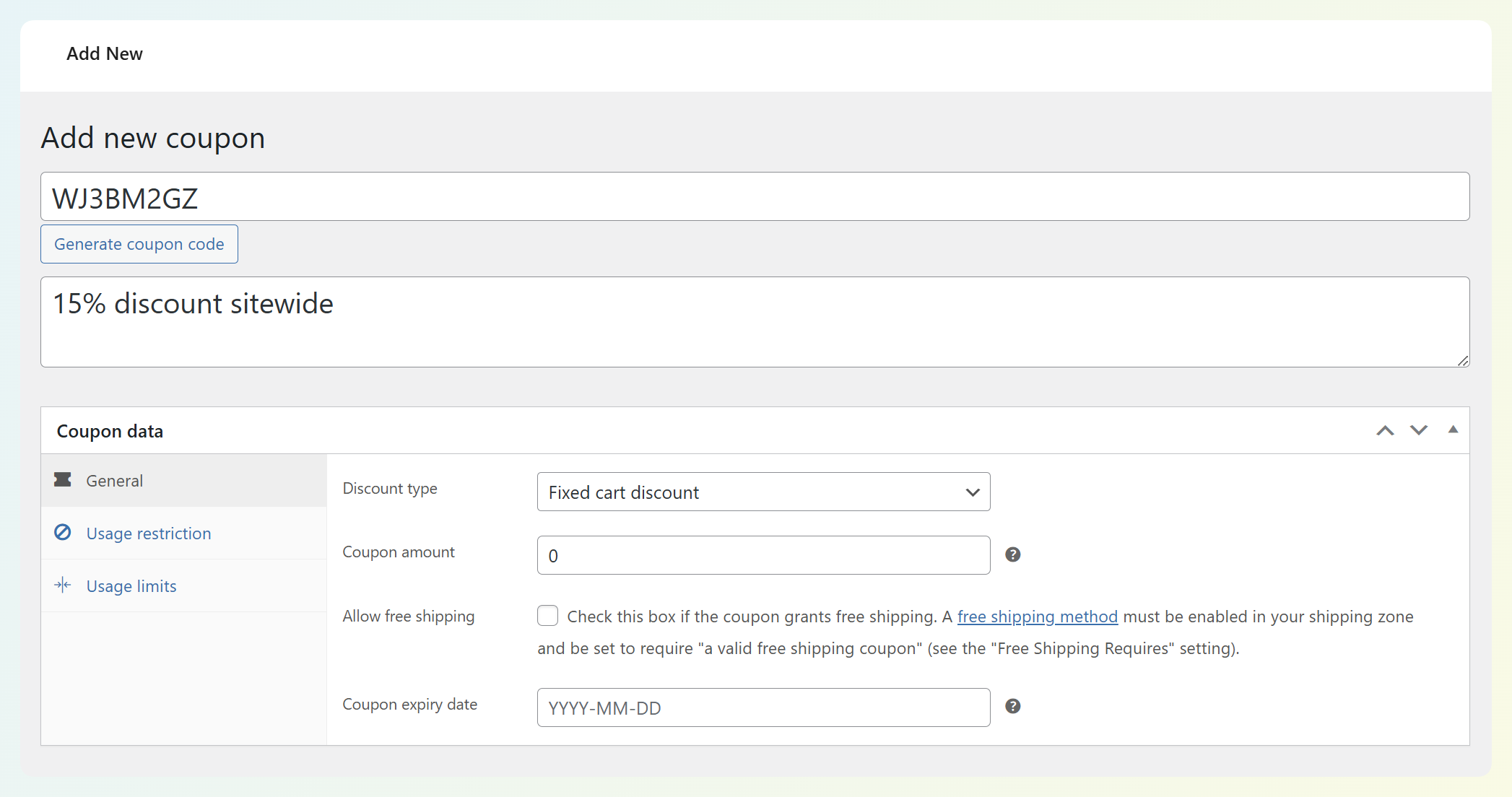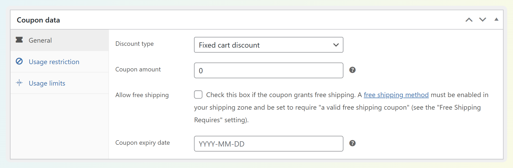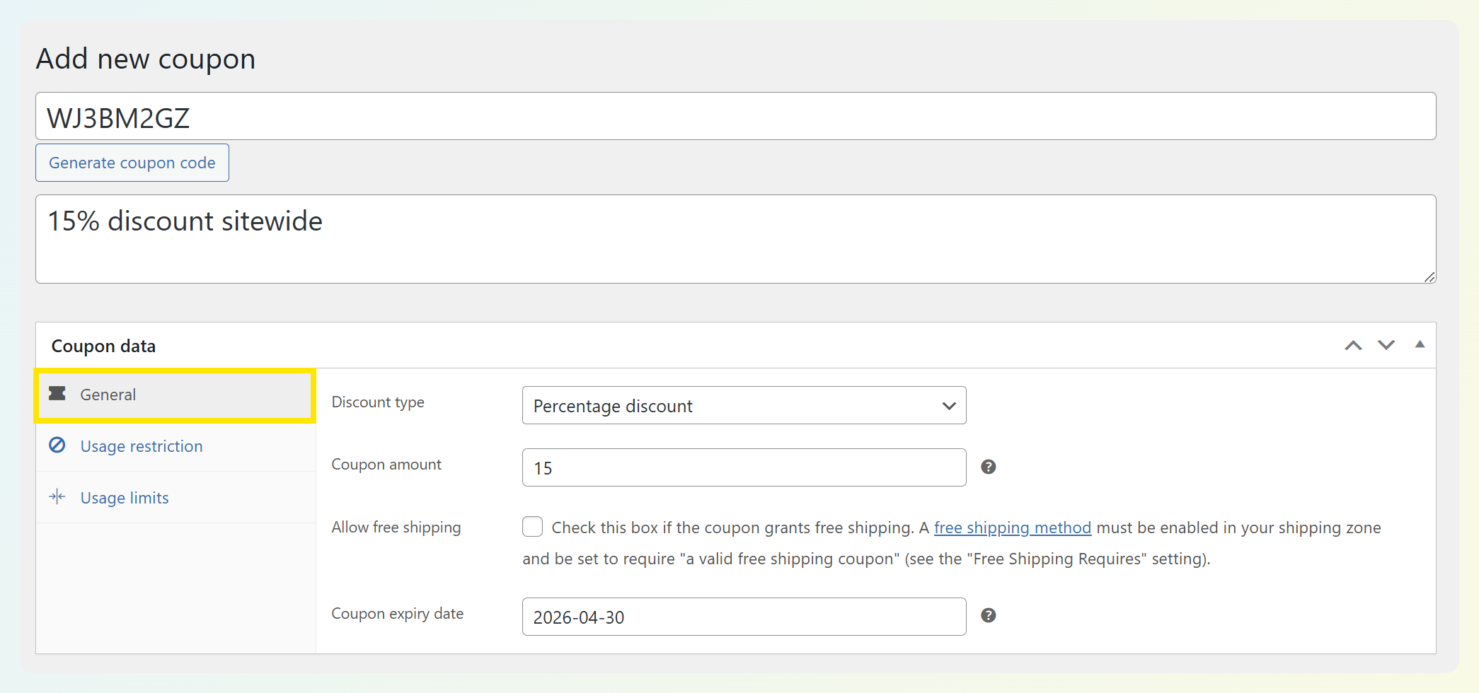 Once you’ve entered your coupon code, you’ll spend most of your time in the Coupon data panel. WooCommerce organizes coupon settings into three main areas: General, Usage restriction, and Usage limits.