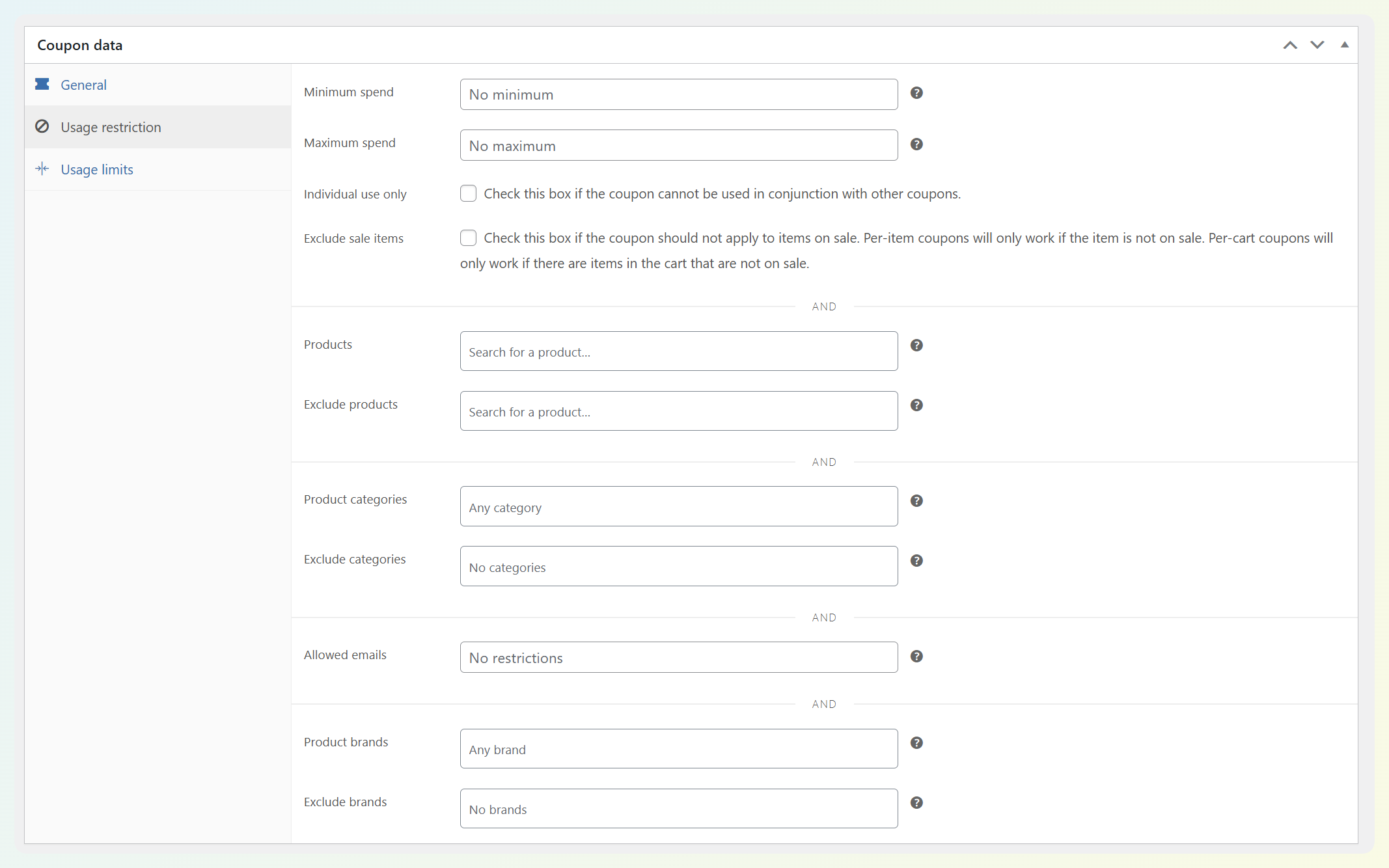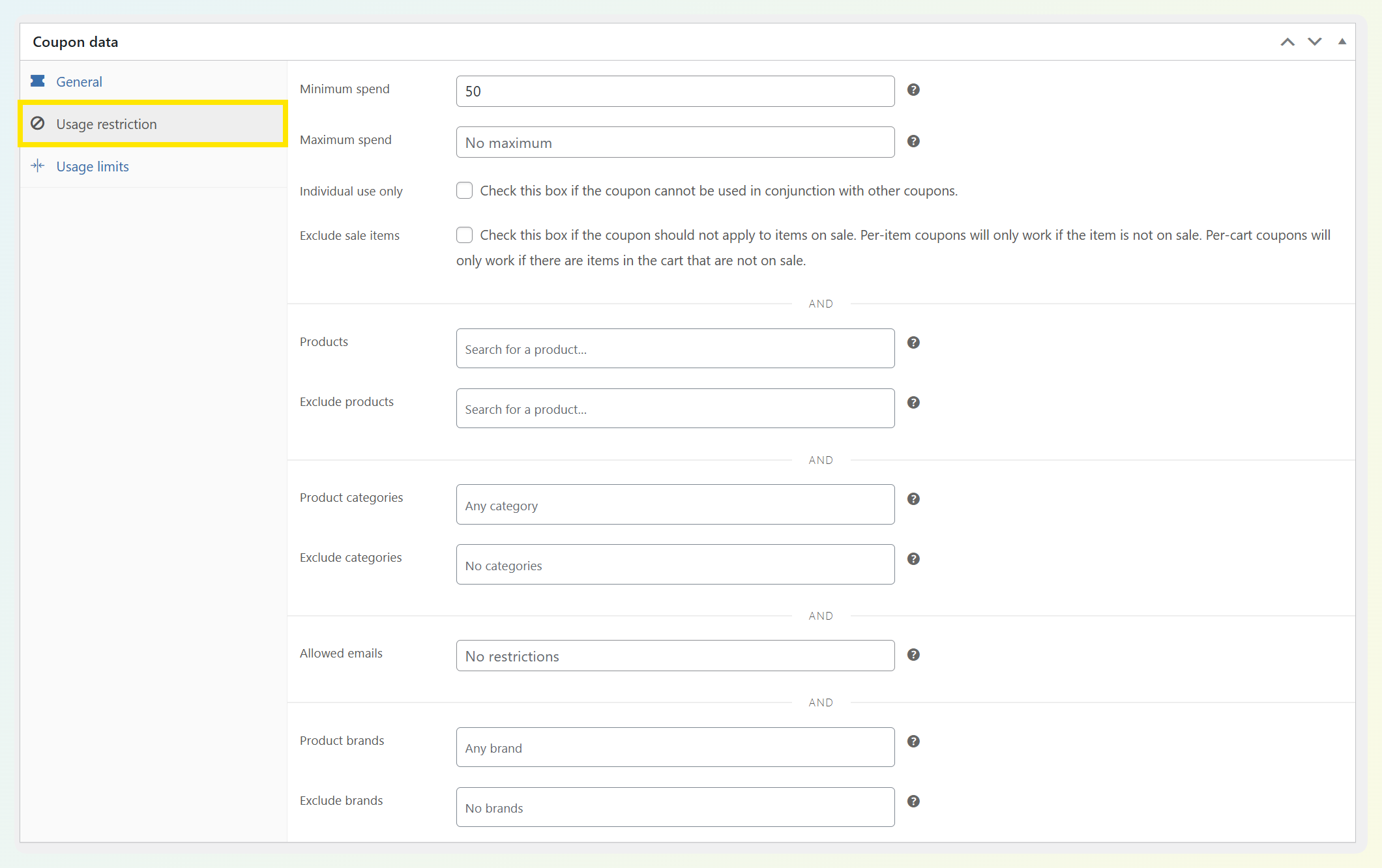 What we’ve seen store owners run into: Coupons “not working” because a single item in the cart is excluded (sale item, wrong category, or the minimum spend isn’t met). If a coupon isn’t applying, this tab is usually the first place to check.