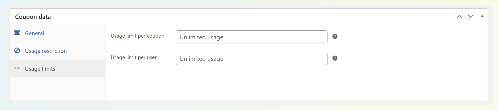 The Usage Limits tab controls how many times a coupon can be redeemed. This is one of the easiest ways to prevent coupon abuse and keep promotions under control.